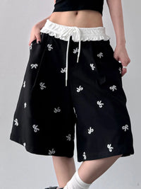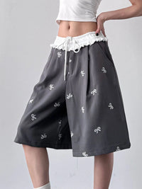 Bow Print Wide Leg Shorts with Contrast Ruffle Waistband