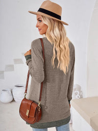 Crochet Contrast V-Neck Long Sleeve Slit T-Shirt