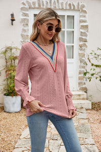 Eyelet Flounce Sleeve V-Neck Blouse