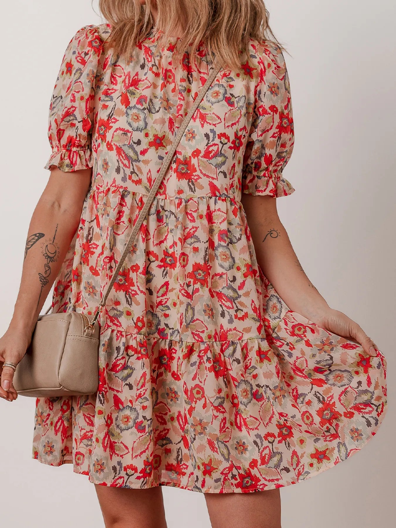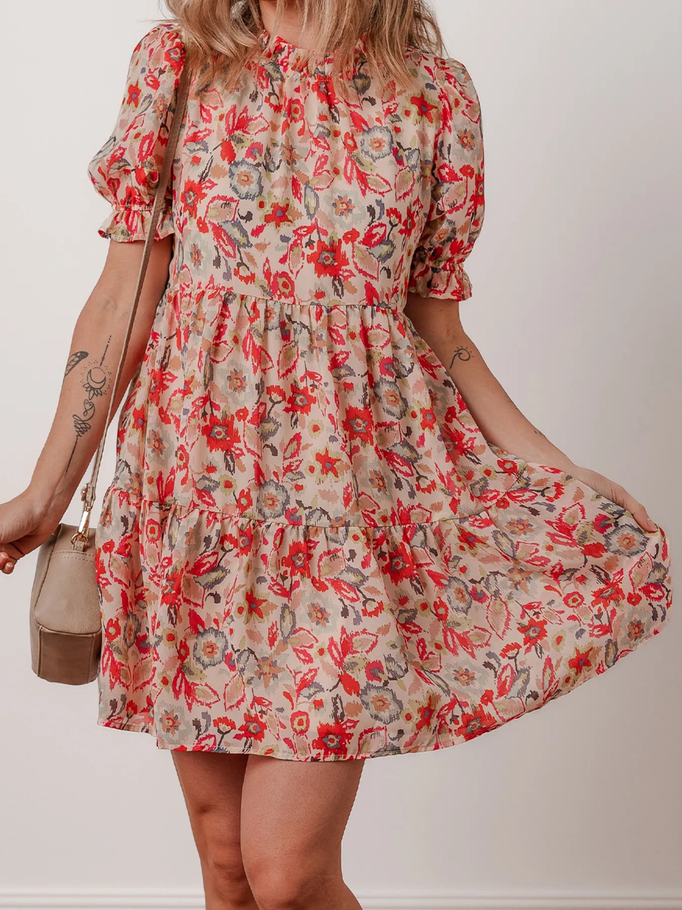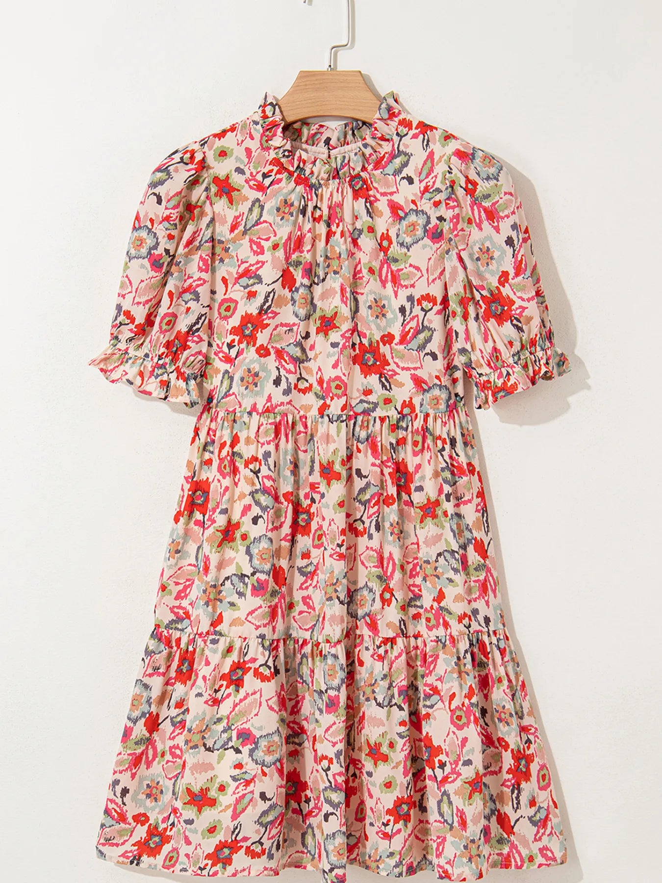 Floral Print Frilled Neck Puff Sleeve High Waist Dress