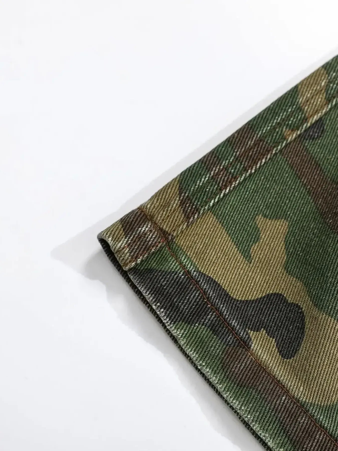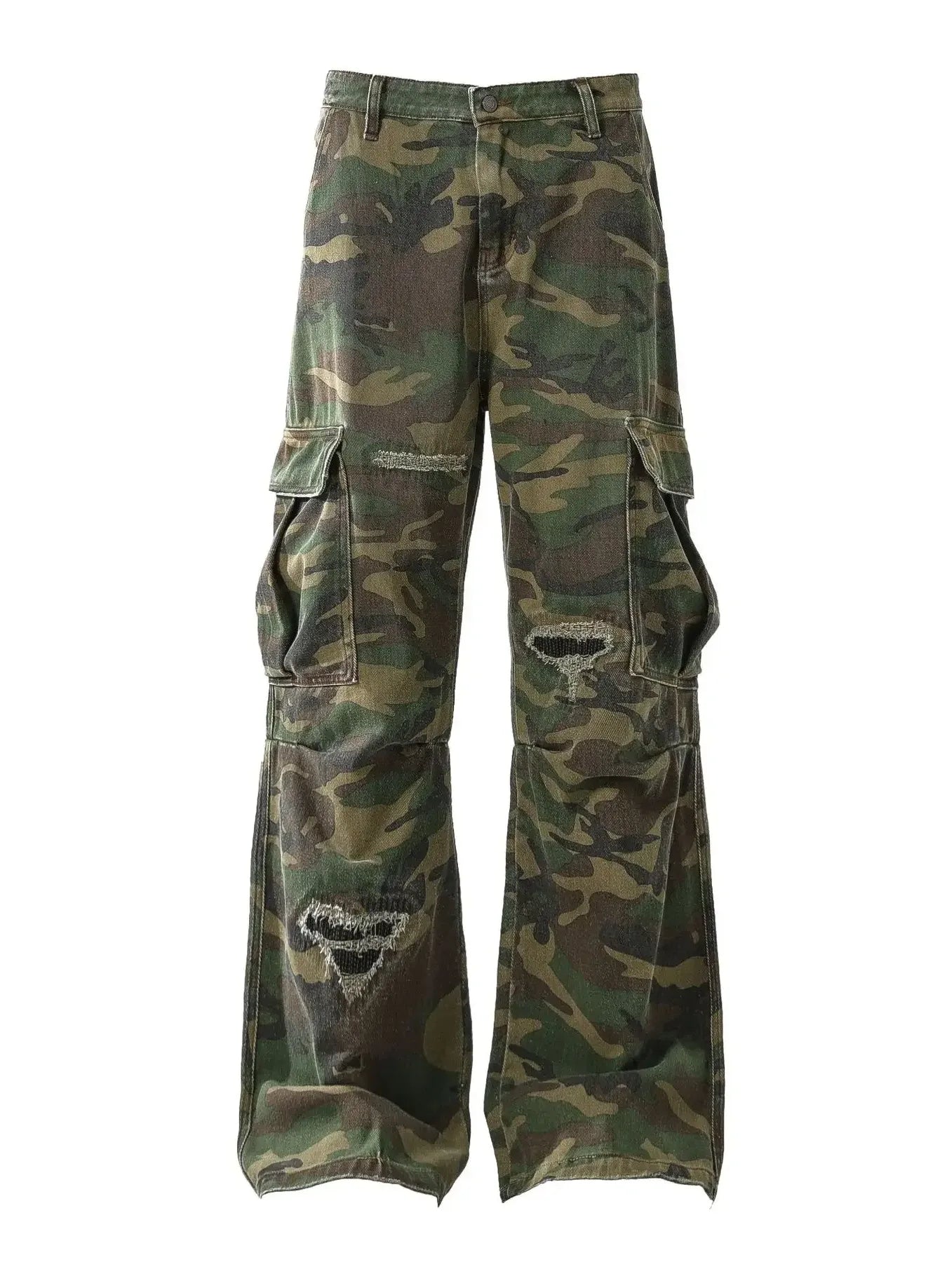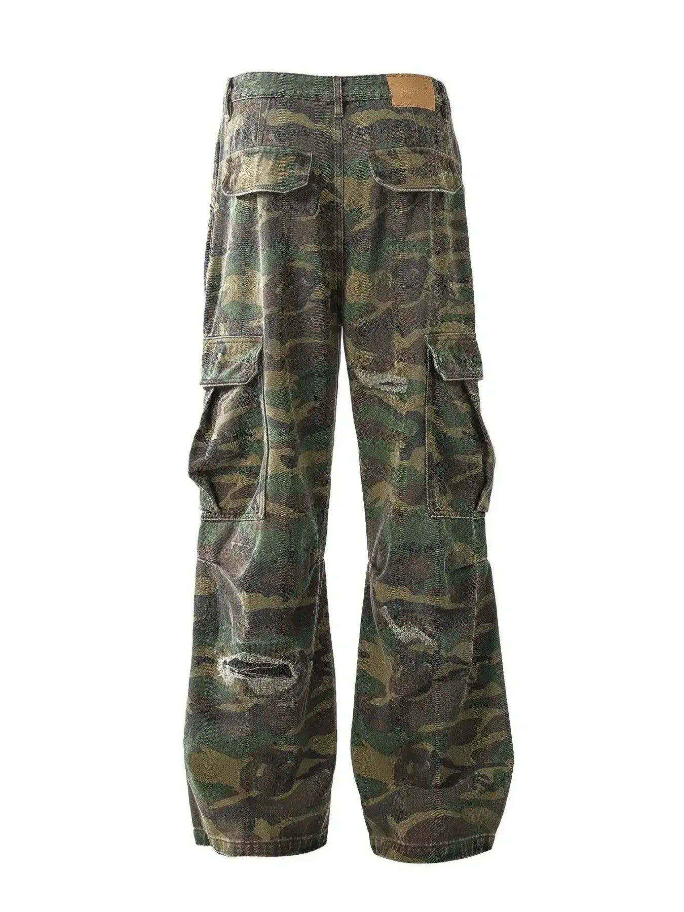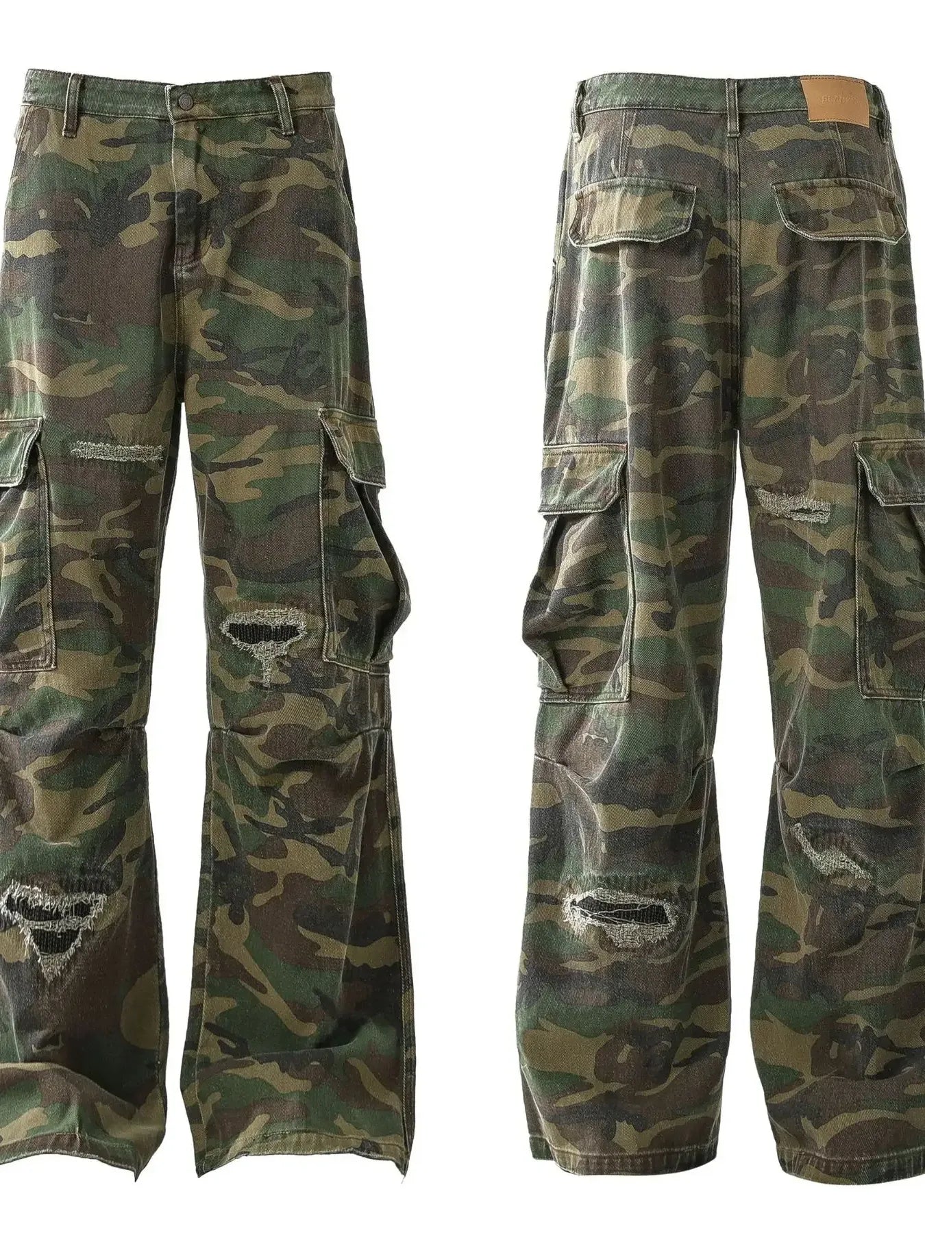 Men's Distressed Camouflage Cargo Pants with Multiple Pockets