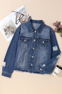 Plus Size Distressed Button Up Raw Hem Denim Jacket