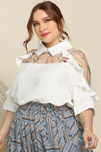 Plus Size Embroidered Ruffle Trim Collared Half Sleeve Blouse