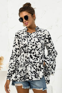 Printed Flare Sleeve Tie Neck Ruffle Trim Blouse
