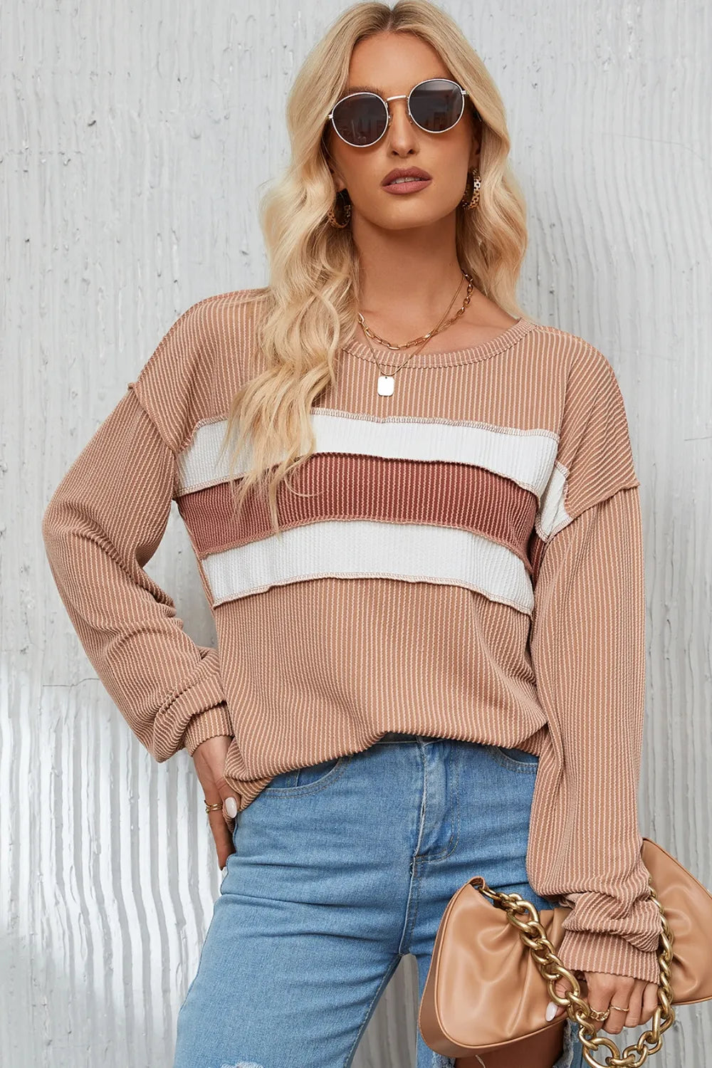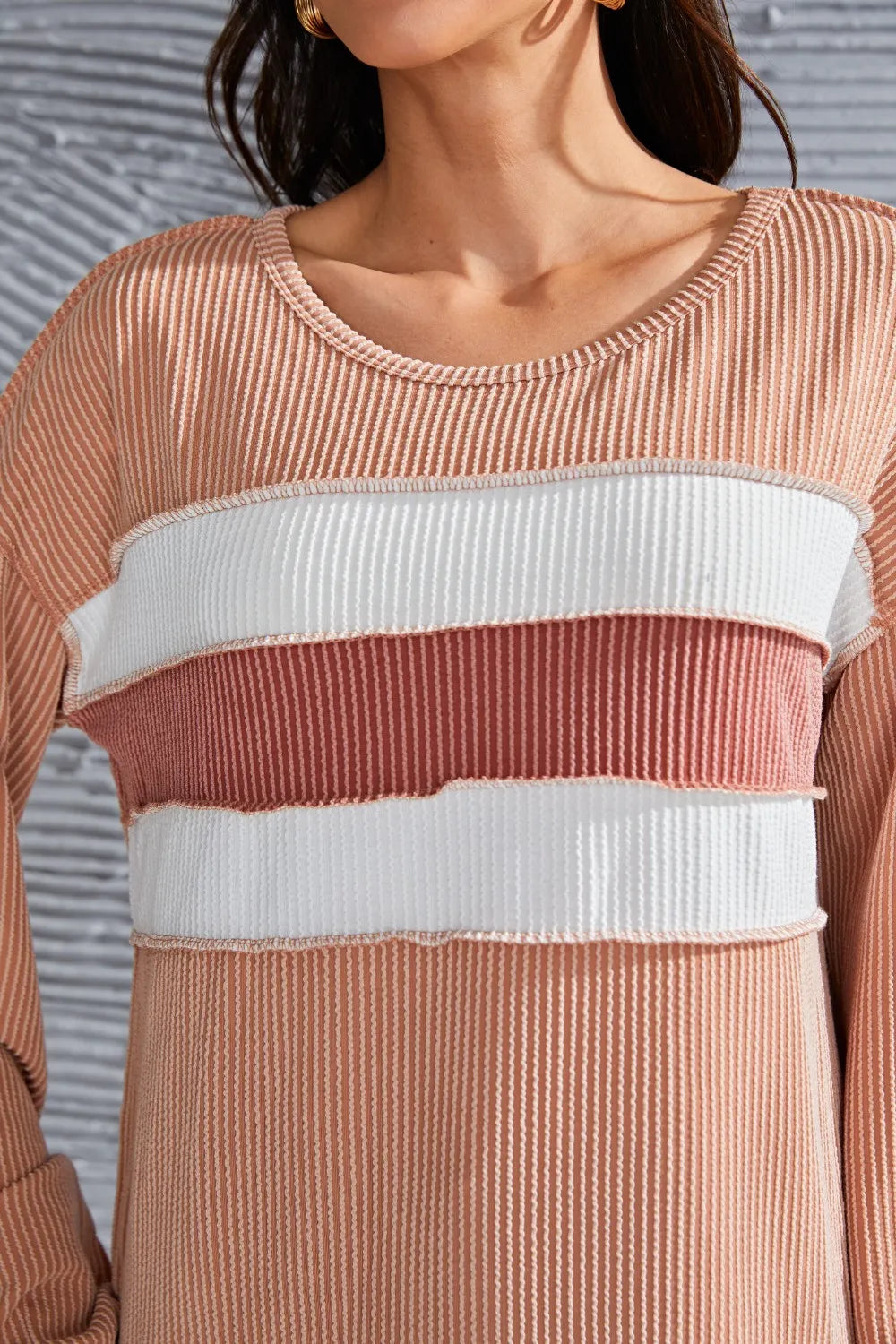 Ribbed Color Block Exposed Seam Round Neck Blouse