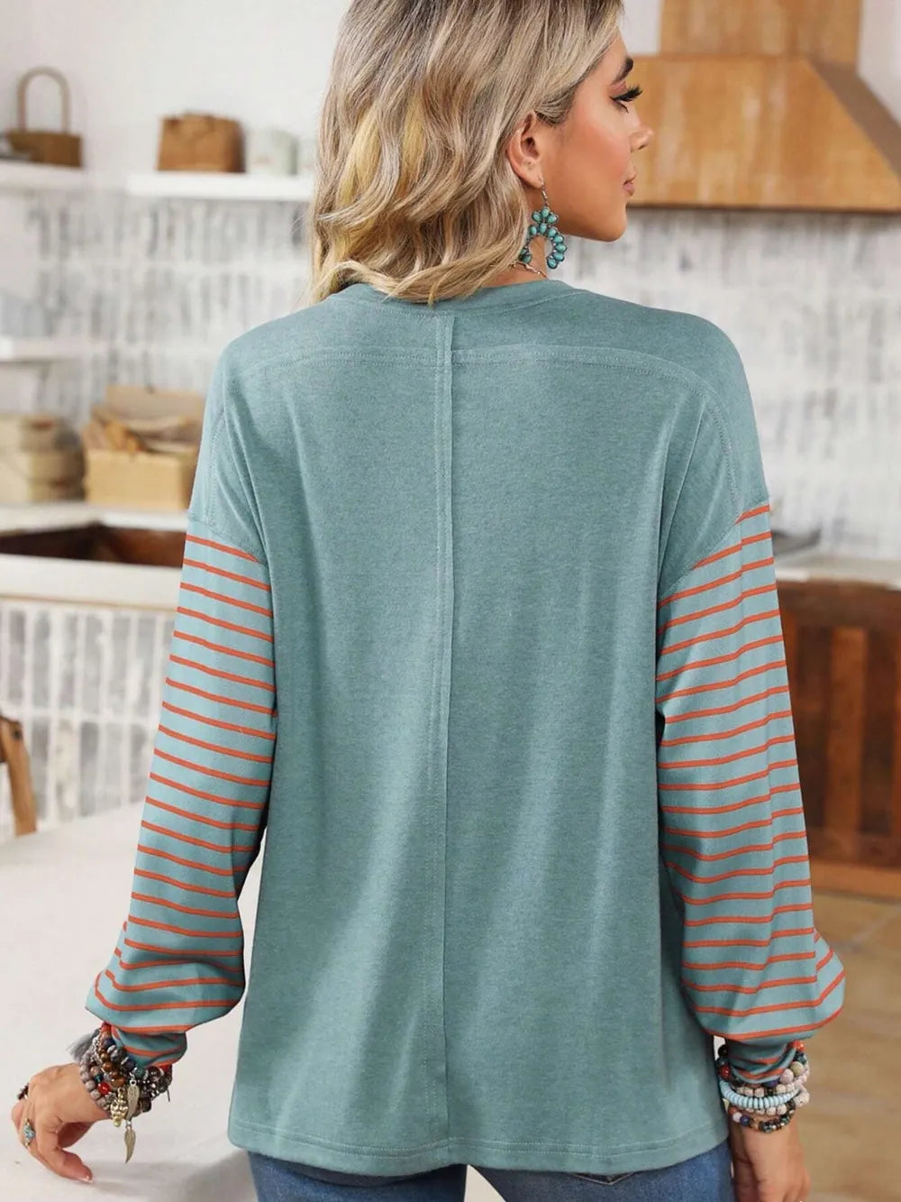 Round Neck Striped Long Sleeve Slit T-Shirt