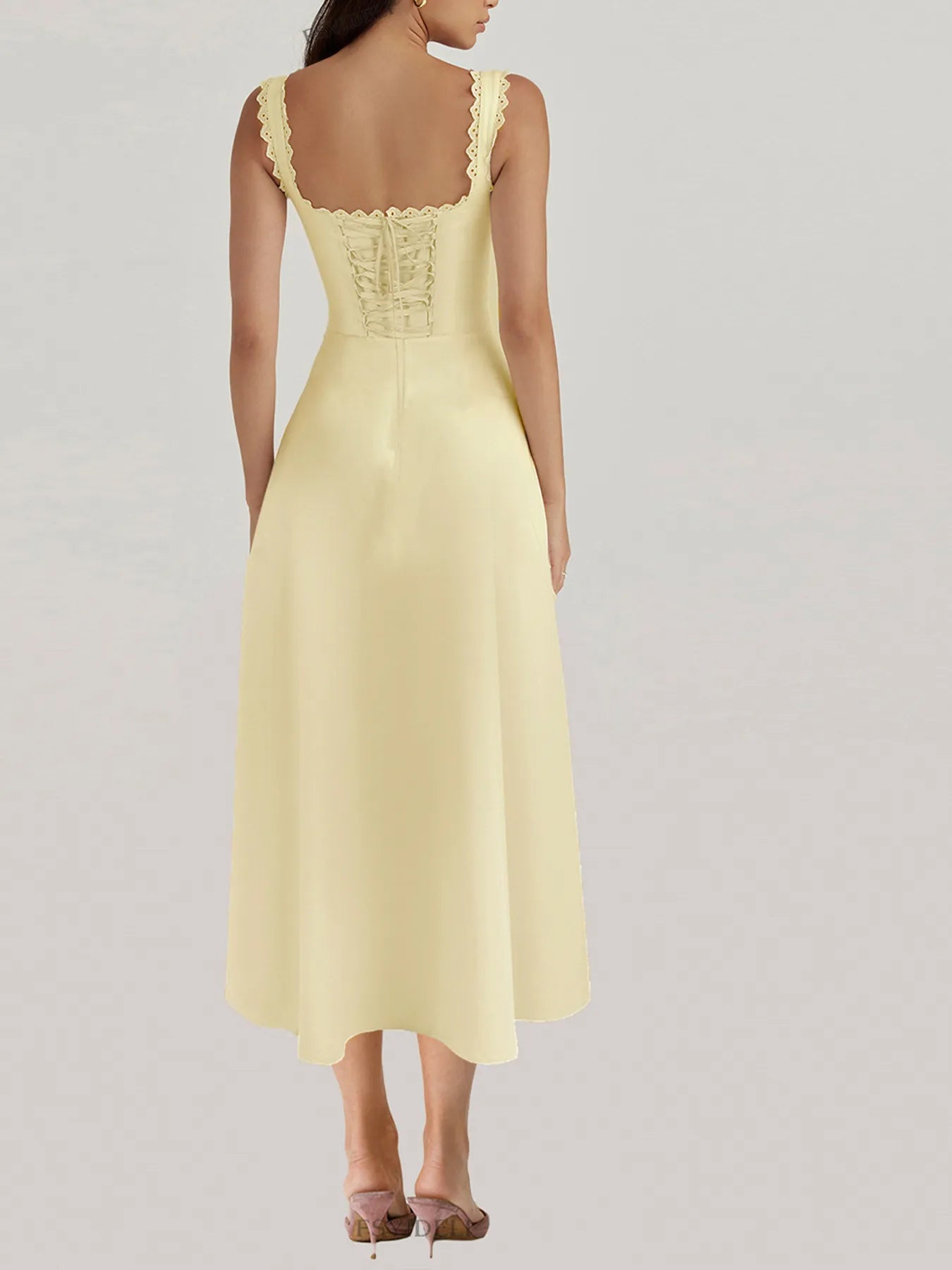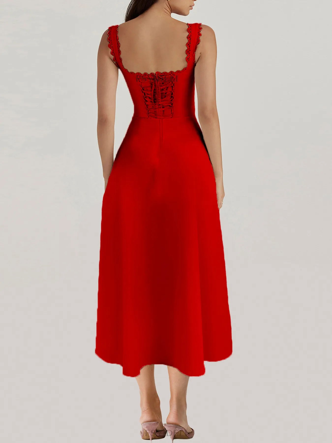 Scalloped V-Neck Midi Dress with Back Lace-Up