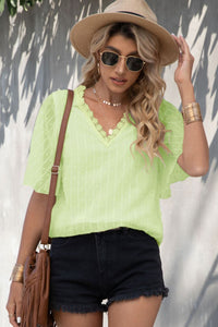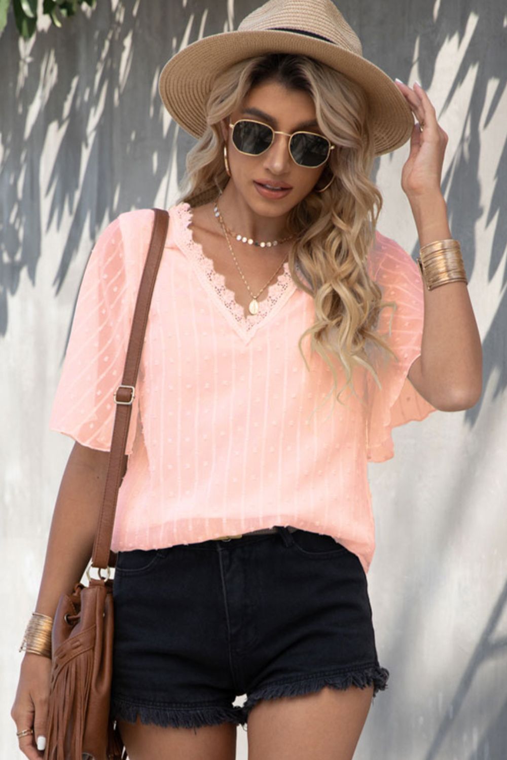 Shiny Swiss Dot Lace Trim Flutter Sleeve V-Neck Blouse
