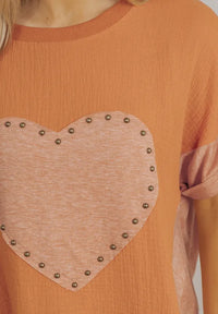 Stud Heart Patch Round Neck Short Sleeve T-Shirt