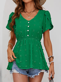 Swiss Dot Buttoned Petal Sleeve Peplum Blouse