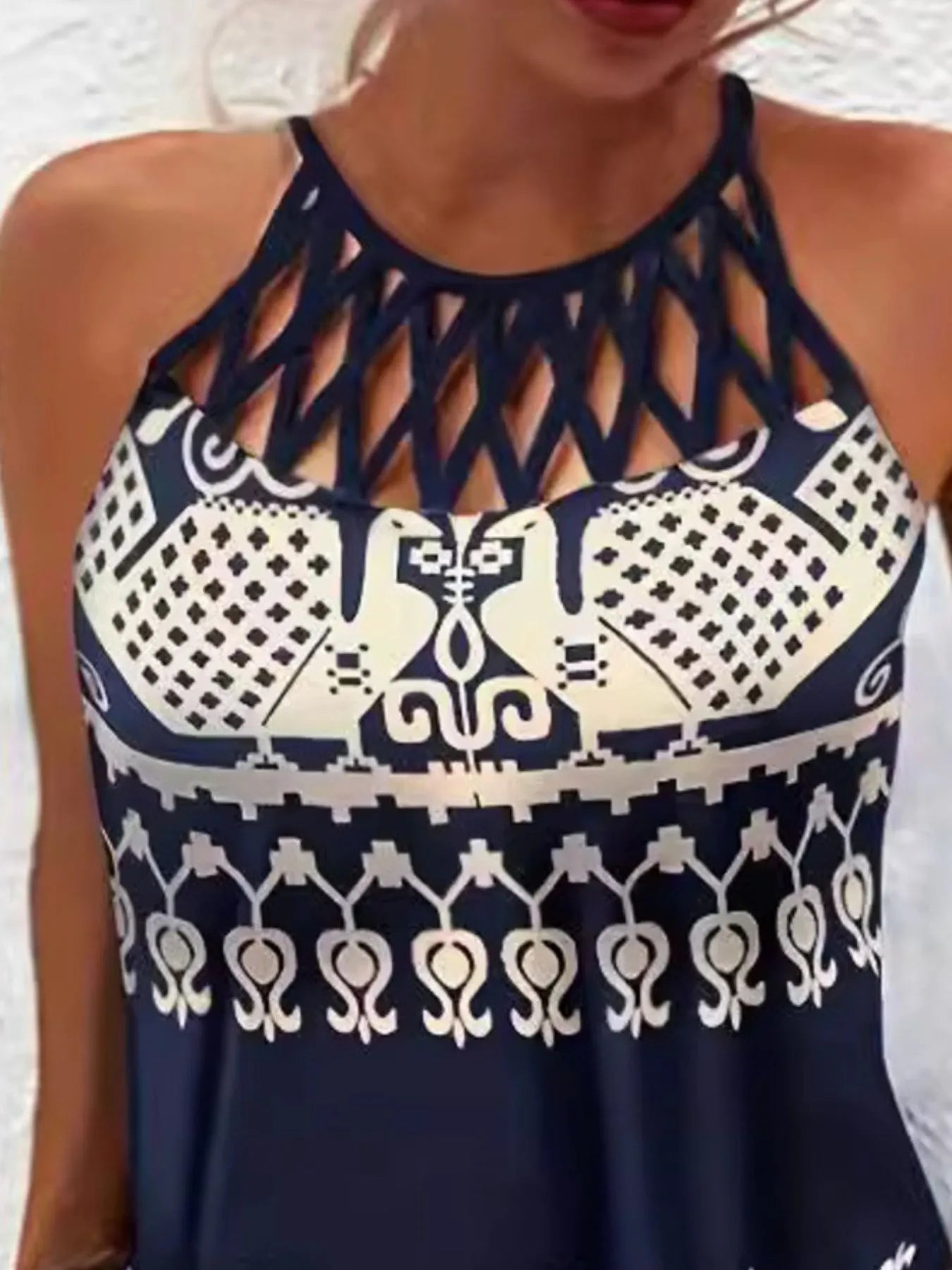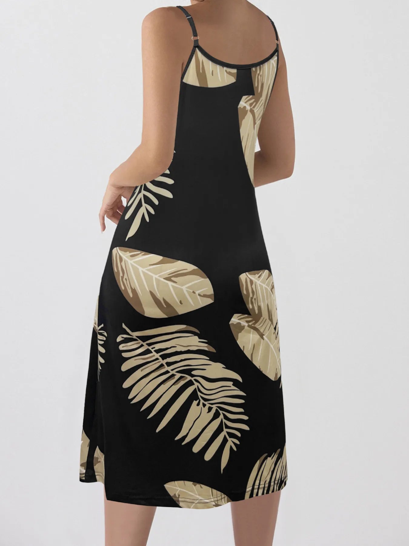 Tropical Leaf Print Halter Neck Mini Dress with Cutout Detail