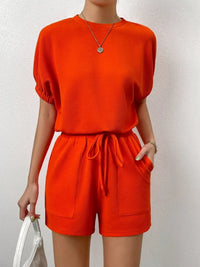 Waffle-Knit Round Neck T-Shirt and Pocketed Shorts Lounge Set